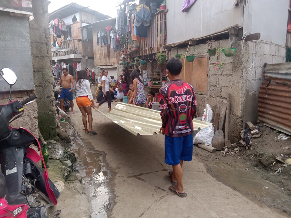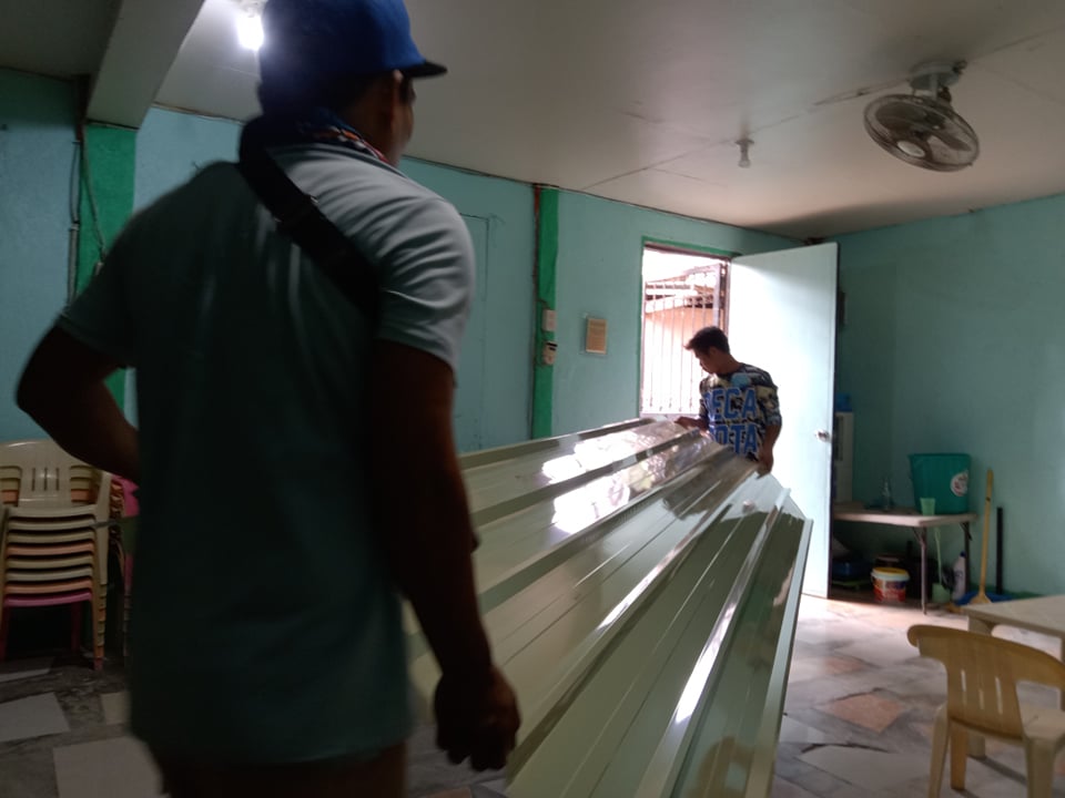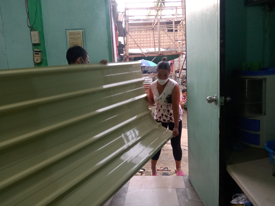 内容:河川沿いに生活し倒壊損壊被害の大きかったタリサイ市ドゥムログ村ホープ地区の12世帯へ、メッキ塗装されたトタン板の屋根材を配給