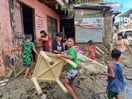 幼児教育を実施してきたホープセンターは、泥まみれに。プリンターやテキストをはじめ文具類も使えなくなった。地域の子どもも大人も一緒に、清掃活動に協力する様子。