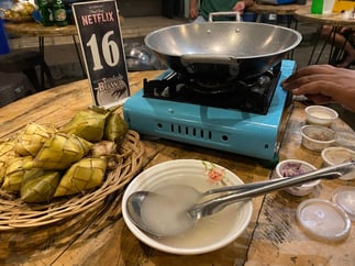①オーダーすると、コンロ、白く濁ったスープ、ソース(レバーなど)、玉ねぎやにんにくなどの薬味、プソ(葉っぱに包まれたライスです)が運ばれてきます。