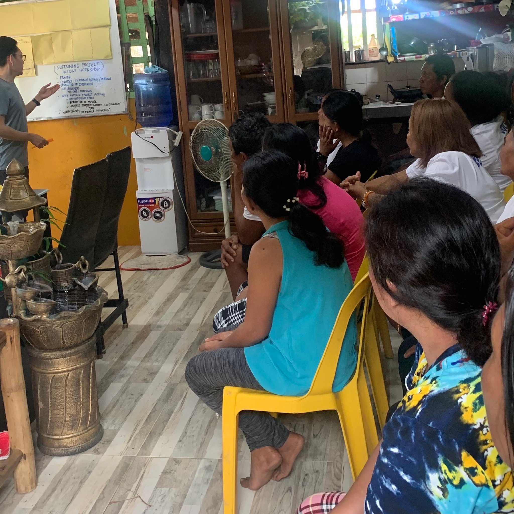 今年8月に、現地協働NGO TSKスタッフ、フィリピン人環境コンサルタント チャムさんとともに、環境事業を担当する私川原もアルマー島を訪れ、今後の持続可能な活動に向けたワークショップを実施しました。事業の成果や課題をグループのみんなで整理して、事業を継続していく力をつけることが目標でした。