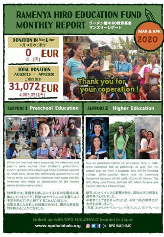 ホープ幼稚園では3月に予定していた修了式ができず、 今、入園式もできませんでした。行政から「対面での教 育」も禁止され、病気にもかかりやすい幼児を対象にし た授業を行うことのリスクを考えて、今年は1年【休園】 することとなりました。この休園期間も、よりよい幼児教 育サービスを再開する準備期間として、資金確保や運 営整備を行います。