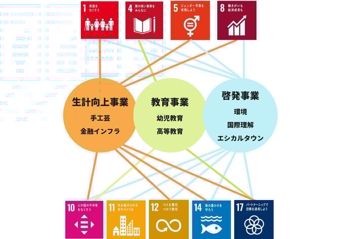 エシカルなライフスタイルを促進することで、女性や障がいを持った人々が、リーダーシップを発揮して起業や活躍しやすい社会にしていこうとしています。フィリピンでも女性たちがものづくりグループをつくることで、経済的社会的自立につながっています。また、日本の中でフェアトレードやウェルフェアトレードなどへの理解を促進することで、理解が深まっています。